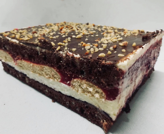 Ciasto z kremem, galaretką truskawkową i biszkopcikami, całość jest oblana czekoladą i posypana orzeszkami.