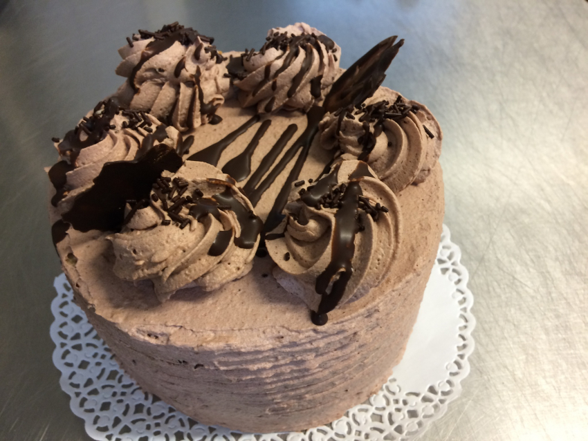 Biszkopt przekładany bitą śmietaną o smaku czekoladowym i owocami.