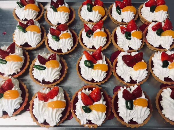 Krucha babeczka wypełniona galaretką oraz kremem przyozdobiona owocami.