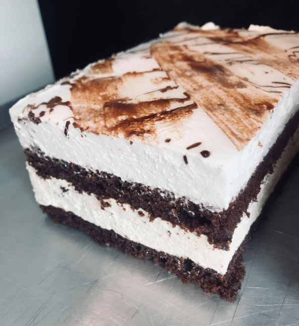 Czekoladowy biszkopt przekłady bitą śmietaną o smaku bananowym.