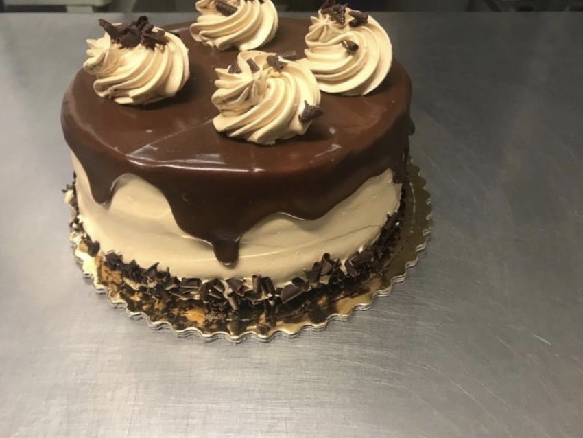 Biszkopt przekładany bitą śmietaną o smaku czekoladowym, oblany czekoladą.
