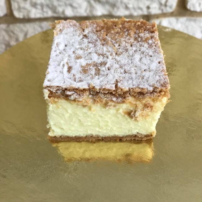 Ciasto francuskie przełożone kremem i posypane cukrem pudrem.